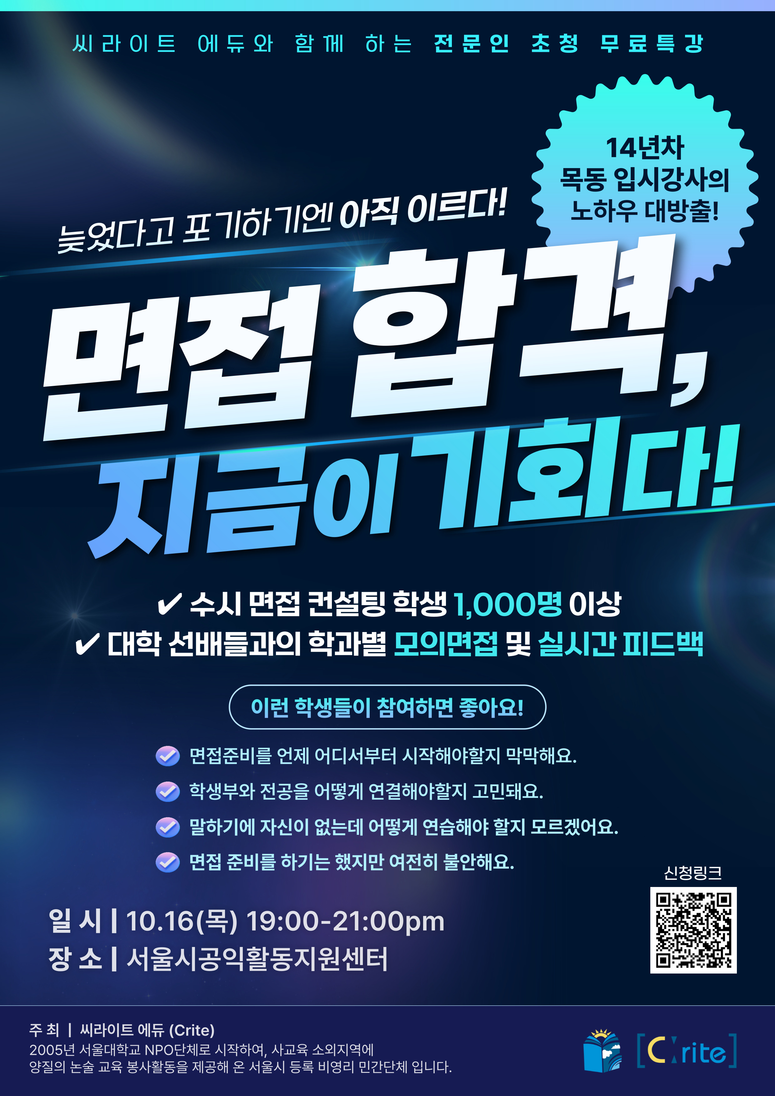 🎓 면접 준비, 어디서부터 시작해야 할지 막막한가요? • 학생부와 전공 연결이 고민인 학생 • 말하기에 자신 없고, 연습 방법을 몰라 불안한 학생 • 준비는 했지만 여전히 확신이 없는 학생 이런 고민을 가진 고3이라면, 14년차 입시 강사의 실전 모의면접 특강으로 돌파구를 찾아보세요! 🗓️ 일시: 10월 16일(수) 오후 7시 📍 장소: 서울시 공익활동지원센터 🧑🏫 강사: 목동 […]